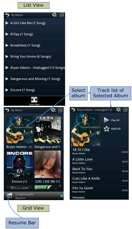- By album screen provides two types of view. List View and Grid View. List view displays each album with its name and number of tracks in each album as list while Grid view displays with cover art in thumbnail mode. When user presses or touches on album name or cover art, tracks under selected album will be displayed in new UI and Long press will open quick menu.