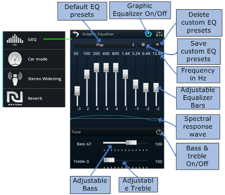 GEQ UI has toggle button to quickly turn on or off GEQ effects, Equalizer bars with their frequency value and text display of bar levels. It also displays true spectral response as graph. User can select any EQ preset by touching/pressing the EQ preset name. User can create custom preset by adjusting EQ bars and save it by pressing save preset button. User can remove EQ preset by pressing delete preset button.