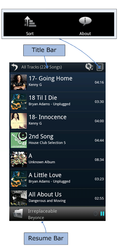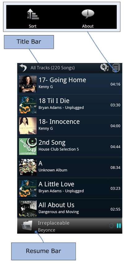 - This UI has Resume Bar at bottom. Resume bar is shortcut to return to playback screen, it displays icon for playlist, title of track, playlist name and icon for current playing state which is either play or pause.