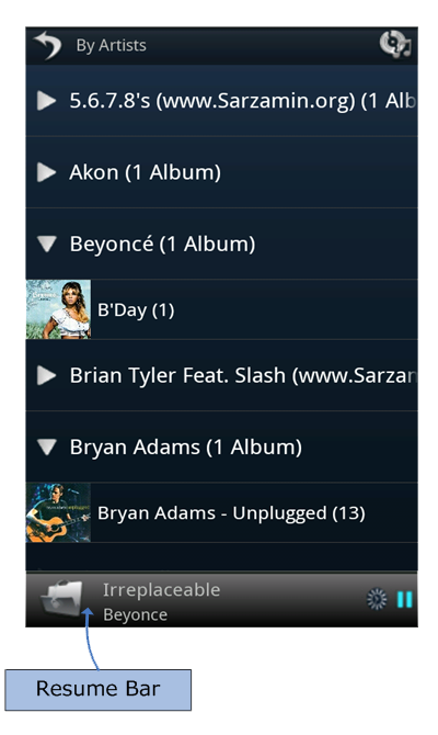 - Now playing screen also contains Resume bar in bottom part. Resume bar is a shortcut to return to playback screen. It displays icon for playlist, title of track, playlist name and icon for current playing state which is either play or pause.