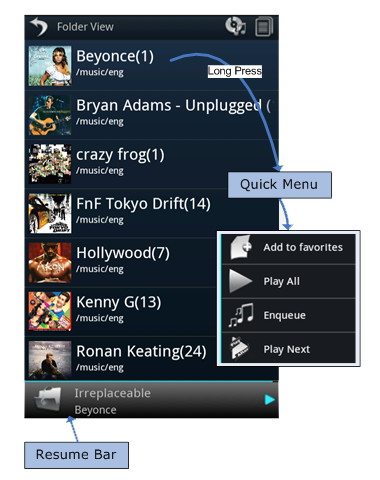 - It will display itemized list of all songs grouped by folder. Each item in list will display cover art of first song, folder name, number of tracks and path for each folder. When user presses or touches on list item, tracks under selected folder will be displayed in new UI and Long press on list item will display Quick Menu containing Add To Favorite option to add all tracks under selected folder to favorite list and Play All option to play all tracks under selected folder without showing tracks under selected folder.