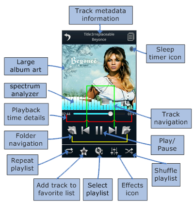 Playback Sceen holds all most commonly used controls. This allows users to perform playback operations quickly with minimum touch/clicks. Playback screen is divided into four blocks: A top bar, middle bar with large albumart, lower middle bar and bottom bar.