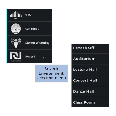 - Reverb Icon will open selection menu with available reverberation environment effects.