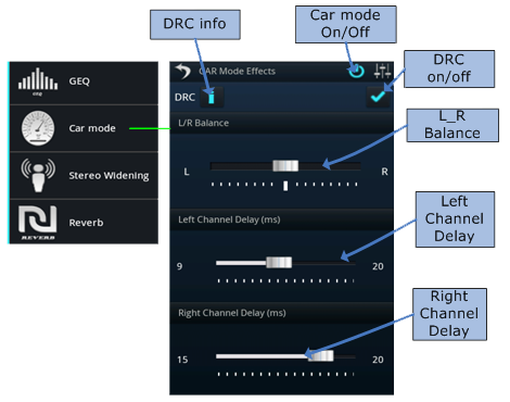 Car Icon Opens Car Audio Effects UI. Car audio effects enhance audio listening experience in a Car. Car audio effects include DRC, stereo channel balance and stereo channel delay. DRC is used to minimize or compress audio signal range, which is very useful while driving to amplify dynamically those hard to hear sounds. Stereo Channel Balance means the amount of signal from each channel for stereo audio. Stereo Channel Delay means delay/lag in audio output between two audio channels. The car mode in combination with a tuned GEQ can provide best listening experience.