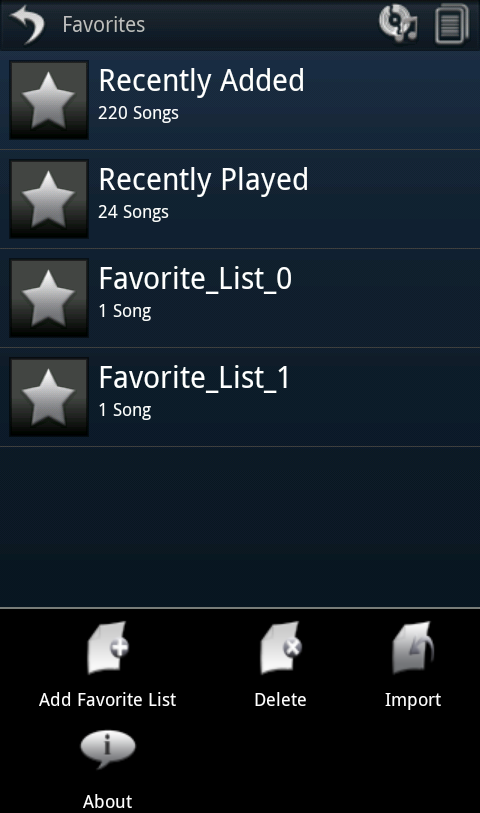 - When user presses MENU key, UI will display menu with following selectable options: Add Favorite List will allow user to add new custom favorite playlist, Delete option will display multiple selectable context menu to remove one or more favorite playlists, Import option will allow user to import his/her playlist from android’s default music player, Preference option will allow user to change player related settings and About option will show brief information about player